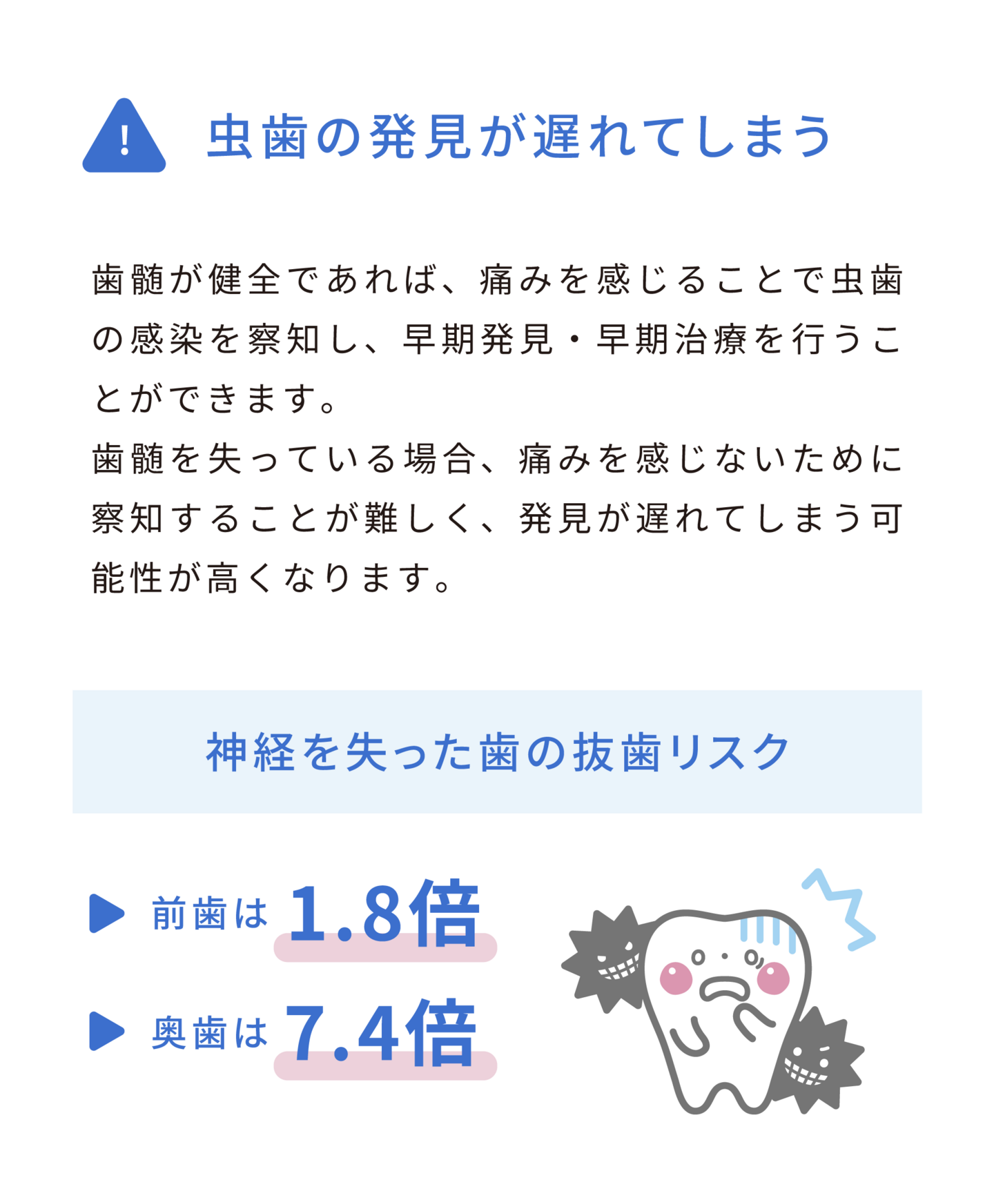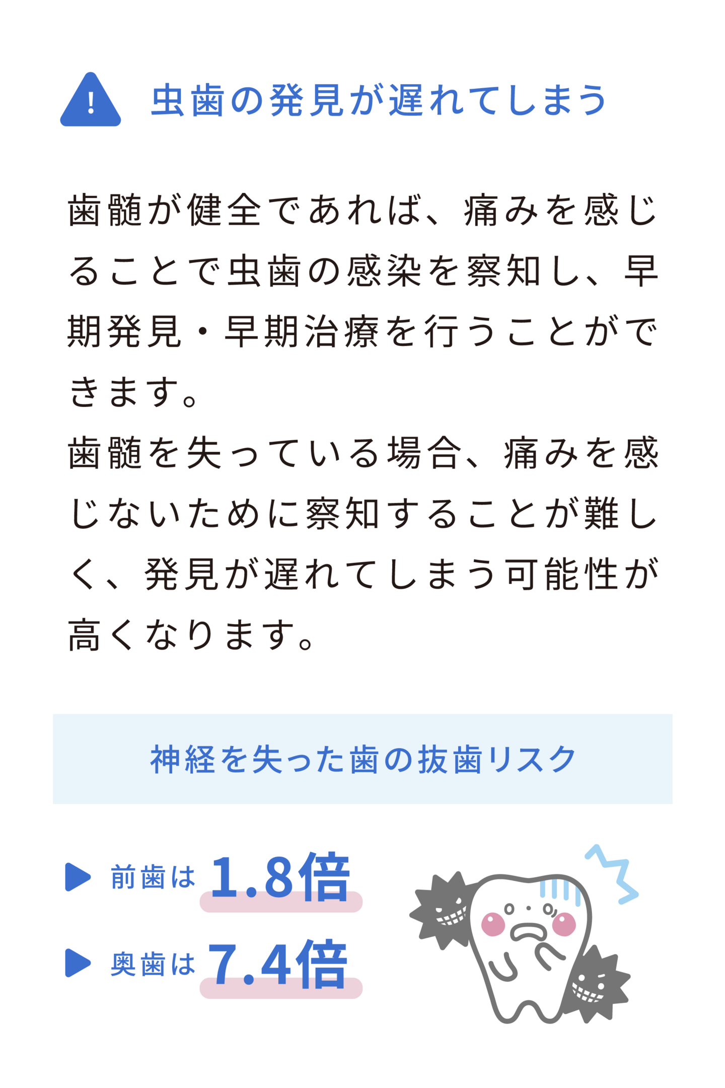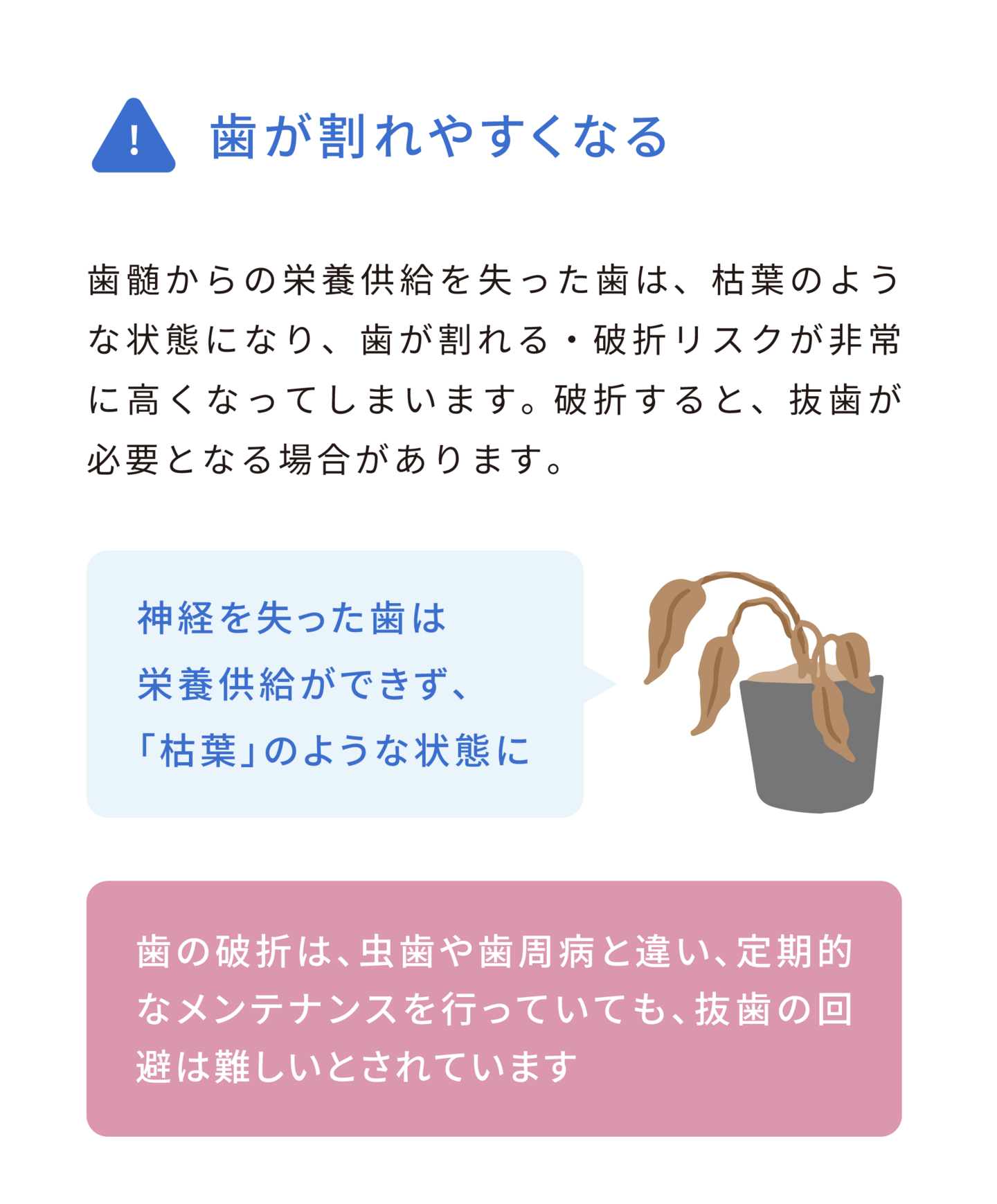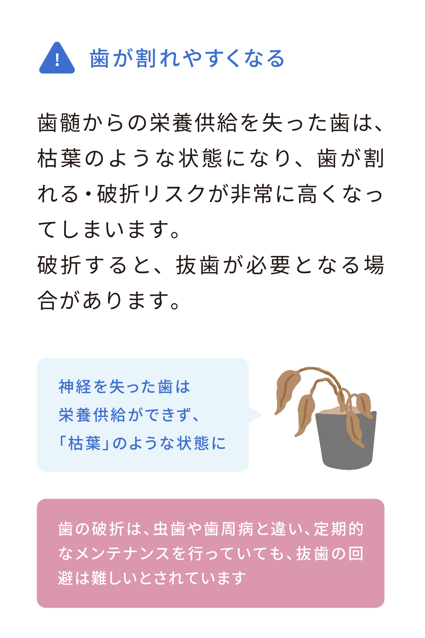 歯髄を失うと、歯の寿命は約40%短くなるといわれています